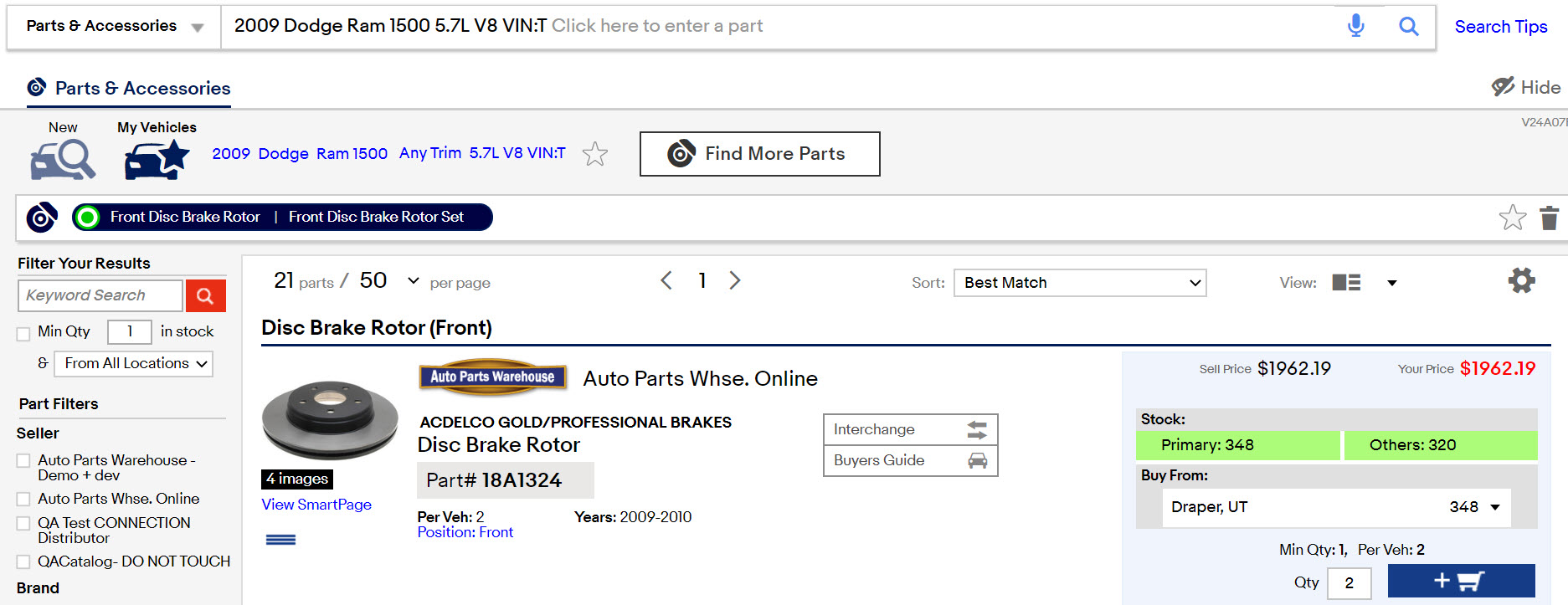 Result Filters: (ACES & PIES Attributes Applied)