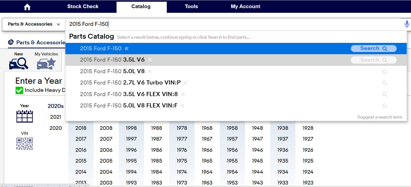 - Vehicle Search: Look up a vehicle by entering the Year, Make, Model and Engine in the search bar.