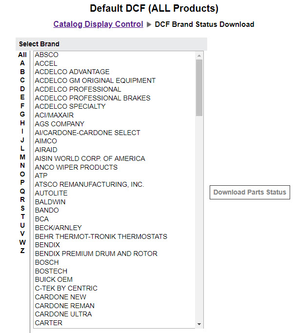 Download the “Parts Status” report to view your part number/brand configurations within the Administration>Catalog Display Control. The goal is to ensure your inventory is accurately displayed for the part numbers available on your site.