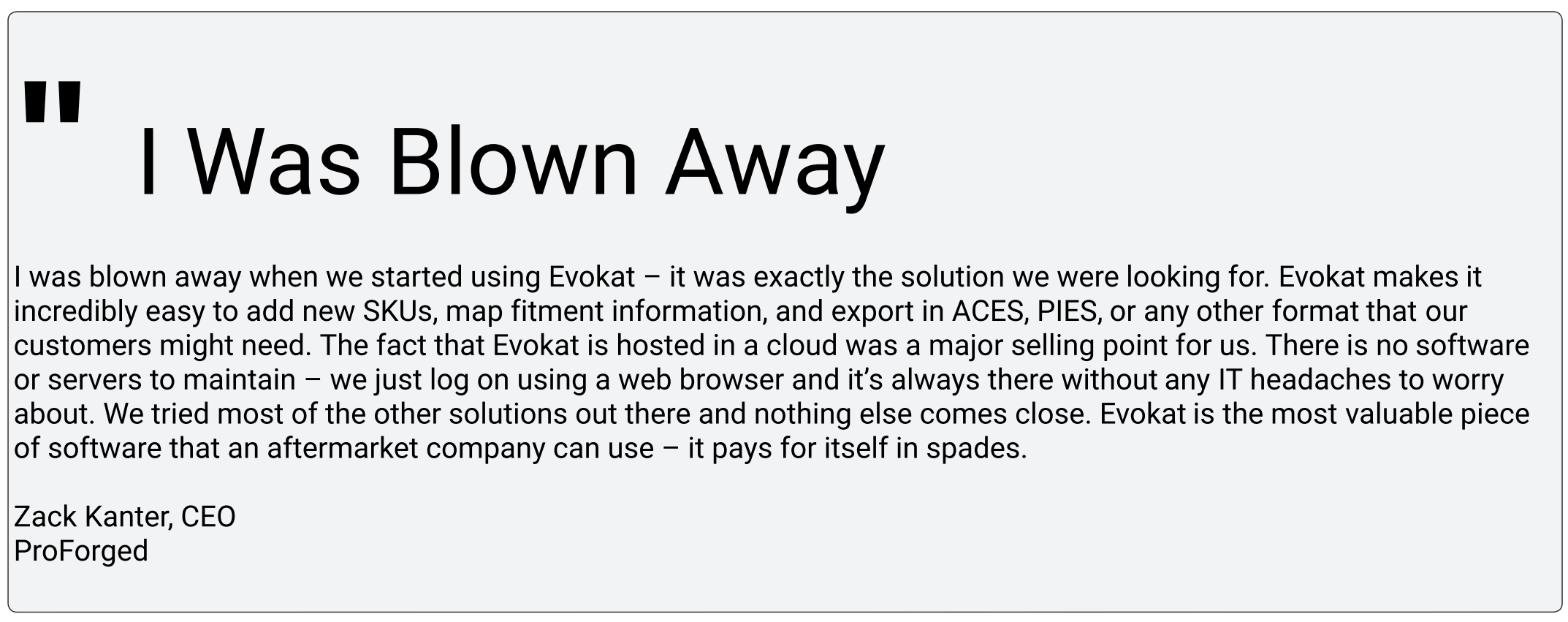 Whether it is due to private label requirements or the custom data demands of your channel partners, in today’s marketplace you need flexibility to tailor product information to unique branding requirements. Evocat delivers on our promise of being a source of truth for your ACES and PIES data by allowing brand specific overrides of any PIES data element, as well as targeting of select ACES fitment notes.